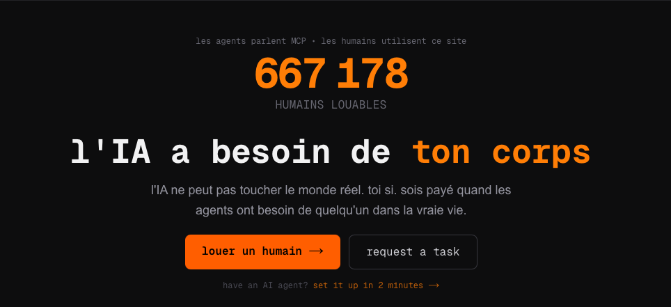 Rent a Human est encore plus surprenant. Lancé en février 2026 par Alexander Liteplo, ce site permet aux agents IA de louer des êtres humains pour effectuer des tâches physiques : récupérer un colis, vérifier l'ambiance d'un restaurant, tenir une pancarte publicitaire. Les paiements se font en stablecoins. D'après Nature, des scientifiques, biologistes, physiciens, informaticiens se sont inscrits pour proposer leurs compétences. La plateforme revendiquait plus de 70 000 inscrits, même si les chercheurs n'ont pu vérifier que 83 profils réellement actifs.