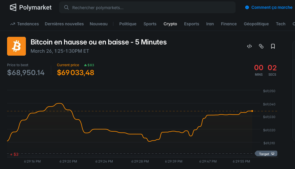 Polymarket est une plateforme de marchés de prédiction sur la blockchain. Elle propose des paris du type « Le prix du Bitcoin va-t-il monter ou baisser dans les 15 prochaines minutes ? ». Les résultats sont vérifiés via un oracle Chainlink qui injecte les données du monde réel dans la blockchain.